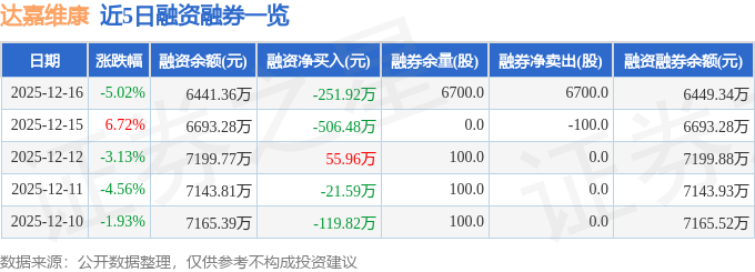 达嘉维康融资融券信息显示,融资方面,当日融资买入725.27万元,融资偿还977.19万元,融资净偿还251.92万元。融券方面,融券卖出6700.0股,融券偿还0.0股,融券余量6700.0股,融券余额7.98万元。融资融券余额6449.34万元。