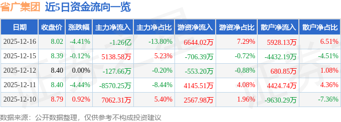 证券之星消息,截至2025年12月16日收盘,省广集团(002400)报收于8.02元,下跌4.41%,换手率6.51%,成交量112.4万手,成交额9.11亿元。