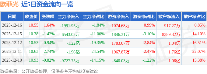 证券之星消息,截至2025年12月16日收盘,欧菲光(002456)报收于10.55元,上涨1.64%,换手率3.12%,成交量103.28万手,成交额10.84亿元。