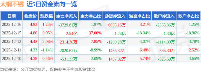 证券之星消息,截至2025年12月16日收盘,太钢不锈(000825)报收于4.92元,上涨1.23%,换手率6.62%,成交量377.01万手,成交额18.96亿元。