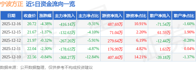 12月16日的资金流向数据方面,主力资金净流出416.14万元,占总成交额9.31%,游资资金净流入487.69万元,占总成交额10.91%,散户资金净流出71.54万元,占总成交额1.6%。