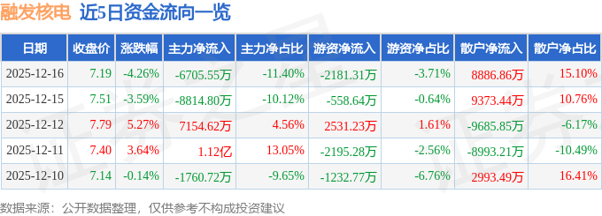 证券之星消息,截至2025年12月16日收盘,融发核电(002366)报收于7.19元,下跌4.26%,换手率6.46%,成交量81.2万手,成交额5.88亿元。