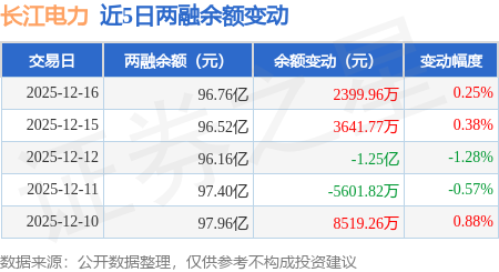 证券之星消息,12月16日,长江电力(600900)融资买入1.41亿元,融资偿还1.15亿元,融资净买入2615.03万元,融资余额96.6亿元。