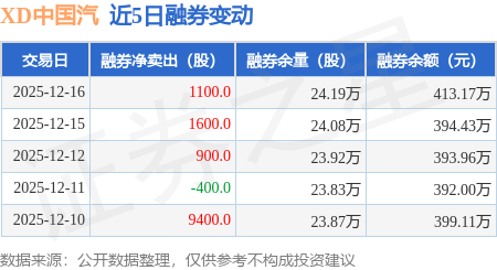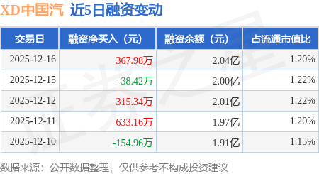 证券之星消息,12月16日,XD中国汽(601965)融资买入2223.08万元,融资偿还1855.1万元,融资净买入367.98万元,融资余额2.04亿元,近20个交易日中有12个交易日出现融资净买入。