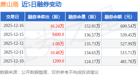 证券之星消息,12月16日,唐山港(601000)融资买入614.56万元,融资偿还703.63万元,融资净卖出89.07万元,融资余额1.34亿元,近20个交易日中有11个交易日出现融资净买入。