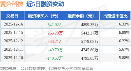 证券之星消息,12月16日,赛分科技(688758)融资买入448.29万元,融资偿还991.22万元,融资净卖出542.92万元,融资余额4899.35万元。