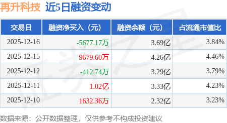 证券之星消息,12月16日,再升科技(603601)融资买入2.33亿元,融资偿还2.89亿元,融资净卖出5677.17万元,融资余额3.69亿元,近20个交易日中有13个交易日出现融资净买入。