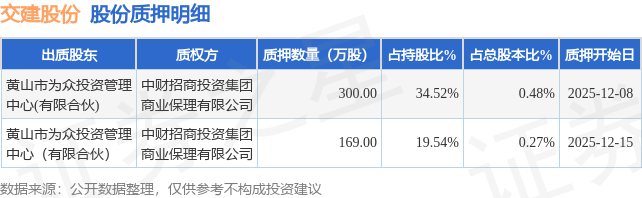 证券之星消息,交建股份(603815)12月17日公开信息显示,股东黄山市为众投资管理中心(有限合伙)、黄山市为众投资管理中心(有限合伙)向中财招商投资集团商业保理有限公司合计质押469.0万股,占总股本0.75%。质押详情见下表: