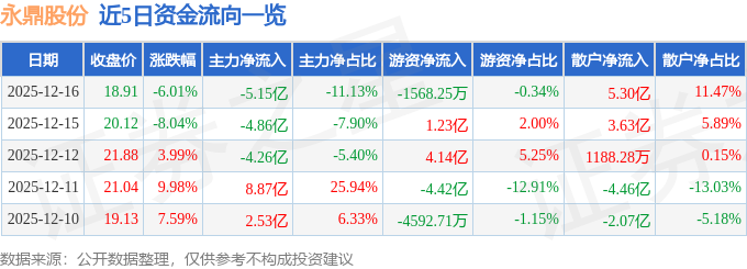 12月16日的资金流向数据方面,主力资金净流出5.15亿元,占总成交额11.13%,游资资金净流出1568.25万元,占总成交额0.34%,散户资金净流入5.3亿元,占总成交额11.47%。