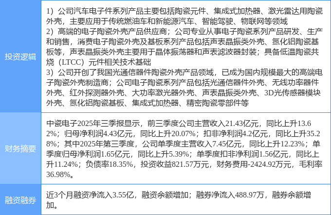 证券之星消息,中瓷电子12月17日涨停收盘,收盘价74.88元。该股于13点12分涨停,未打开涨停,截止收盘封单资金为1.43亿元,占其流通市值0.56%。