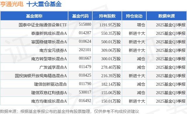 根据2025基金Q3季报公募基金重仓股数据,重仓该股的公募基金共72家,其中持有数量最多的公募基金为国泰基金的国泰中证全指通信设备ETF。国泰中证全指通信设备ETF目前规模为115.52亿元,最新净值2.8207(12月16日),较上一交易日下跌2.92%,近一年上涨110.12%。该公募基金现任基金经理为艾小军。艾小军在任的基金产品包括:国泰金融ETF联接A,管理时间为2014年1月13日至今,期间收益率为175.76%;国泰上证180金融ETF,管理时间为2014年1月13日至今,期间收益率为195.43%;国泰黄金ETF,管理时间为2014年1月13日至今,期间收益率为281.95%;国泰中证计算机主题ETF联接A,管理时间为2015年3月26日至今,期间收益率为-4.84%。