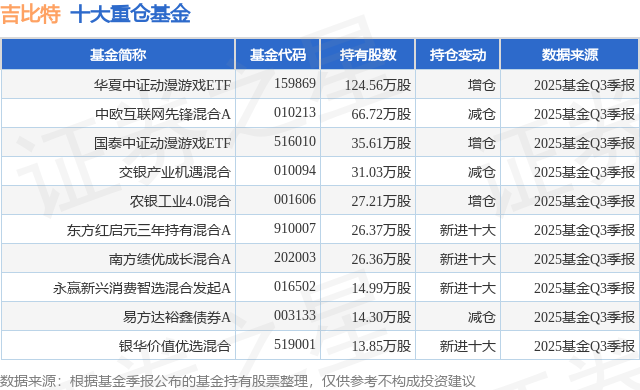 重仓吉比特的前十大公募基金请见下表: