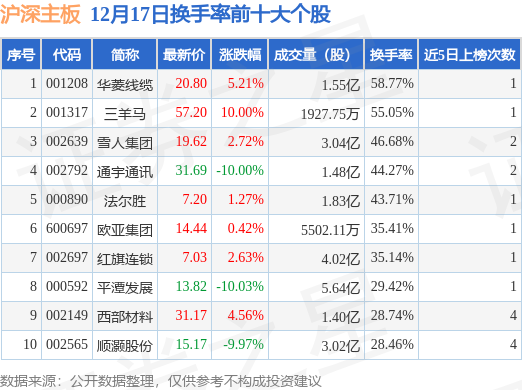 当日沪深主板换手率前10大个股中7只个股收涨,平均涨幅3.83%,其中华菱线缆(001208)以换手率58.77%排第一,4只个股近5个交易日中多次上榜。