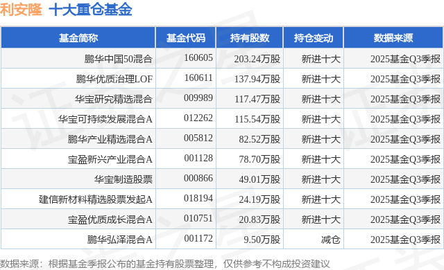根据2025基金Q3季报公募基金重仓股数据,重仓该股的公募基金共20家,其中持有数量最多的公募基金为鹏华基金的鹏华中国50混合。鹏华中国50混合目前规模为13.56亿元,最新净值2.325(12月16日),较上一交易日下跌2.11%,近一年上涨31.43%。该公募基金现任基金经理为王云鹏。王云鹏在任的基金产品包括:鹏华新材料混合发起式A,管理时间为2023年3月28日至今,期间收益率为15.2%。