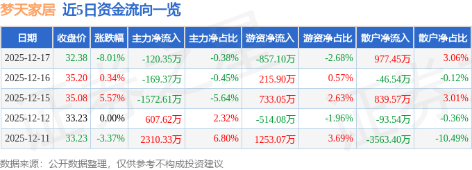 证券之星消息,截至2025年12月17日收盘,梦天家居(603216)报收于32.38元,下跌8.01%,换手率4.37%,成交量9.73万手,成交额3.19亿元。
