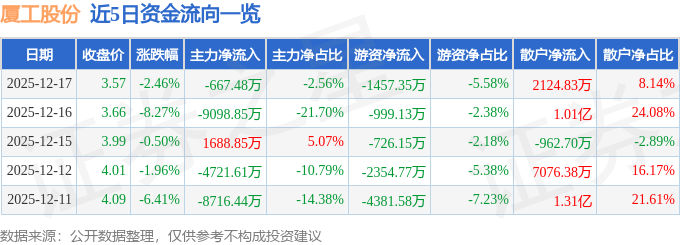 证券之星消息,截至2025年12月17日收盘,厦工股份(600815)报收于3.57元,下跌2.46%,换手率4.15%,成交量73.55万手,成交额2.61亿元。