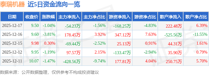 证券之星消息,截至2025年12月17日收盘,泰瑞机器(603289)报收于9.5元,下跌1.04%,换手率1.25%,成交量3.68万手,成交额3482.43万元。