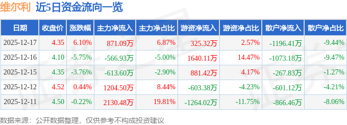 证券之星消息,截至2025年12月17日收盘,维尔利(300190)报收于4.35元,上涨6.1%,换手率3.7%,成交量29.79万手,成交额1.27亿元。
