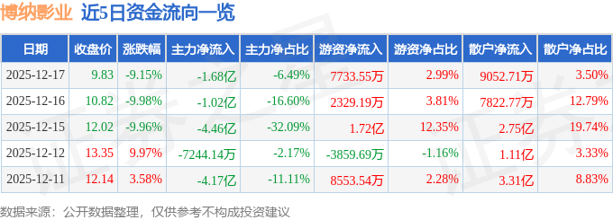 证券之星消息,截至2025年12月17日收盘,博纳影业(001330)报收于9.83元,下跌9.15%,换手率18.82%,成交量258.62万手,成交额25.87亿元。