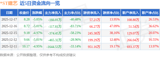 证券之星消息,截至2025年12月17日收盘,*ST建艺(002789)报收于8.28元,下跌5.05%,换手率0.32%,成交量4953.0手,成交额410.11万元。