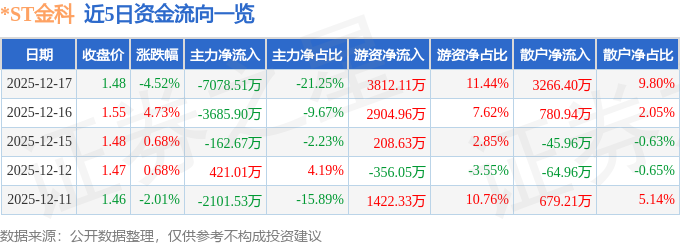 证券之星消息,截至2025年12月17日收盘,*ST金科(000656)报收于1.48元,下跌4.52%,换手率2.92%,成交量222.37万手,成交额3.33亿元。