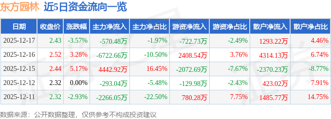 证券之星消息,截至2025年12月17日收盘,东方园林(002310)报收于2.43元,下跌3.57%,换手率2.83%,成交量118.69万手,成交额2.9亿元。