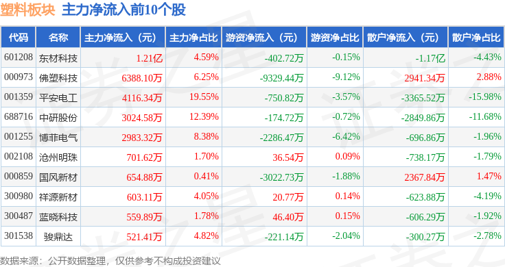 从资金流向上来看,当日塑料板块主力资金净流出1.98亿元,游资资金净流出1.64亿元,散户资金净流入3.62亿元。塑料板块个股资金流向见下表: