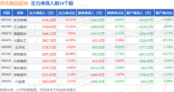 从资金流向上来看,当日农化制品板块主力资金净流入6671.36万元,游资资金净流出2.23亿元,散户资金净流入1.57亿元。农化制品板块个股资金流向见下表: