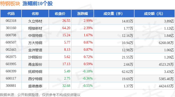 证券之星消息,12月17日特钢板块较上一交易日上涨0.78%,久立特材领涨。当日上证指数报收于3870.28,上涨1.19%。深证成指报收于13224.51,上涨2.4%。特钢板块个股涨跌见下表: