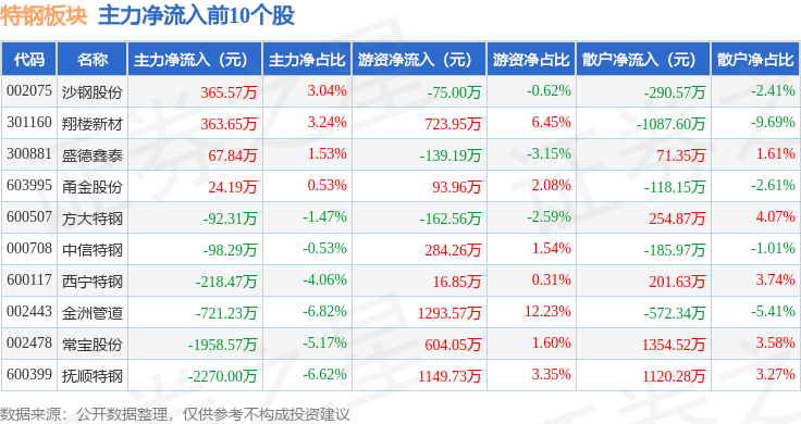 从资金流向上来看,当日特钢板块主力资金净流出1.46亿元,游资资金净流入7461.85万元,散户资金净流入7186.24万元。特钢板块个股资金流向见下表: