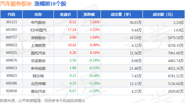 证券之星消息,12月17日汽车服务板块较上一交易日上涨0.3%,中汽股份领涨。当日上证指数报收于3870.28,上涨1.19%。深证成指报收于13224.51,上涨2.4%。汽车服务板块个股涨跌见下表: