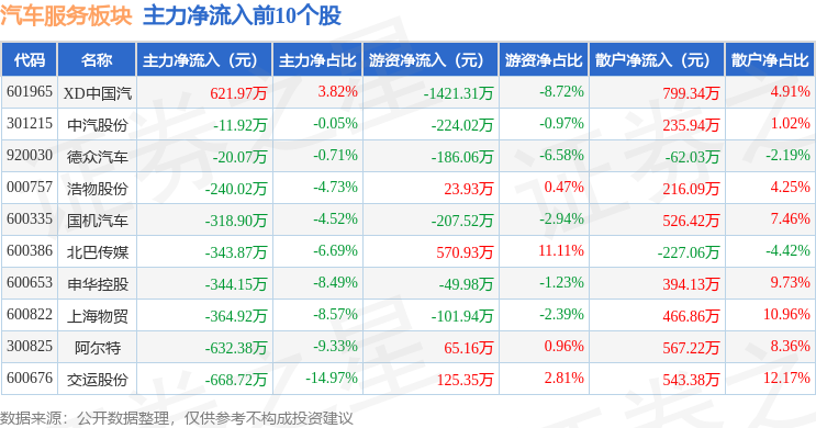 从资金流向上来看,当日汽车服务板块主力资金净流出5101.13万元,游资资金净流出3142.66万元,散户资金净流入8243.79万元。汽车服务板块个股资金流向见下表: