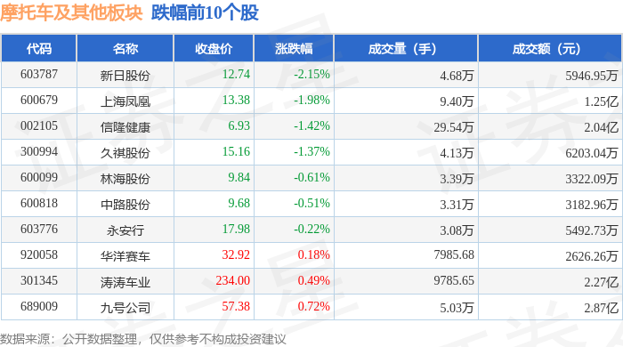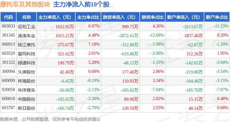 从资金流向上来看,当日摩托车及其他板块主力资金净流出2823.42万元,游资资金净流出1806.83万元,散户资金净流入4630.25万元。摩托车及其他板块个股资金流向见下表: