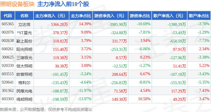 从资金流向上来看,当日照明设备板块主力资金净流入3851.95万元,游资资金净流出4005.37万元,散户资金净流入153.42万元。照明设备板块个股资金流向见下表: