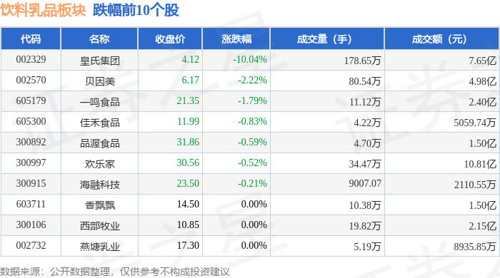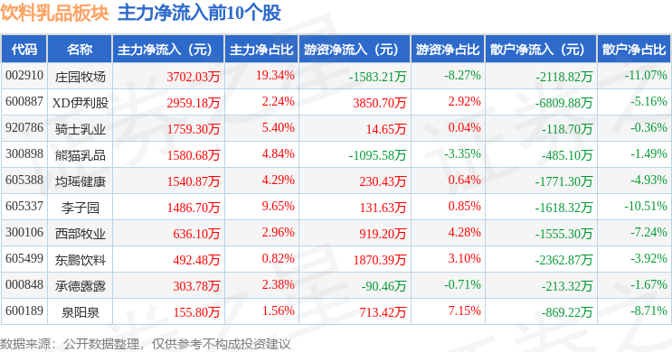 从资金流向上来看,当日饮料乳品板块主力资金净流出2673.94万元,游资资金净流入1.31亿元,散户资金净流出1.04亿元。饮料乳品板块个股资金流向见下表: