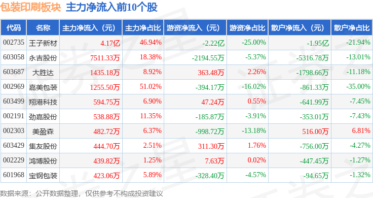 从资金流向上来看,当日包装印刷板块主力资金净流入1.0亿元,游资资金净流出2.31亿元,散户资金净流入1.3亿元。包装印刷板块个股资金流向见下表: