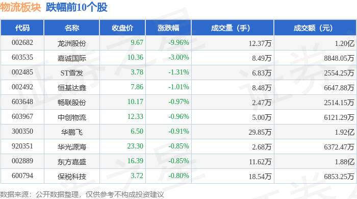 证券之星消息,12月17日物流板块较上一交易日上涨0.47%,海晨股份领涨。当日上证指数报收于3870.28,上涨1.19%。深证成指报收于13224.51,上涨2.4%。物流板块个股涨跌见下表: