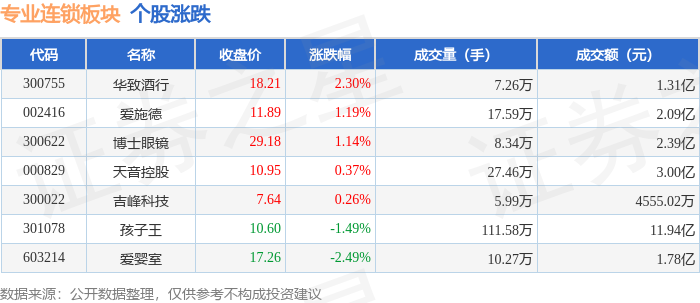 证券之星消息,12月17日专业连锁板块较上一交易日上涨0.32%,华致酒行领涨。当日上证指数报收于3870.28,上涨1.19%。深证成指报收于13224.51,上涨2.4%。专业连锁板块个股涨跌见下表: