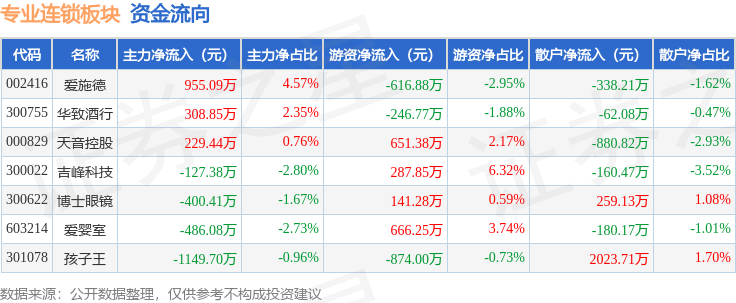从资金流向上来看,当日专业连锁板块主力资金净流出670.19万元,游资资金净流入9.11万元,散户资金净流入661.08万元。专业连锁板块个股资金流向见下表:
