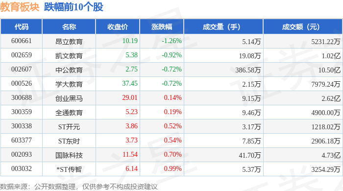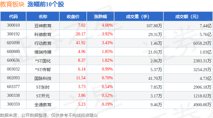 证券之星消息,12月17日教育板块较上一交易日上涨1.06%,豆神教育领涨。当日上证指数报收于3870.28,上涨1.19%。深证成指报收于13224.51,上涨2.4%。教育板块个股涨跌见下表: