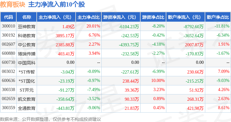 从资金流向上来看,当日教育板块主力资金净流入8897.44万元,游资资金净流出9332.21万元,散户资金净流入434.78万元。教育板块个股资金流向见下表: