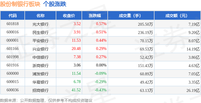 证券之星消息,12月17日股份制银行板块较上一交易日上涨0.01%,光大银行领涨。当日上证指数报收于3870.28,上涨1.19%。深证成指报收于13224.51,上涨2.4%。股份制银行板块个股涨跌见下表: