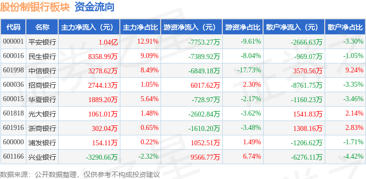 从资金流向上来看,当日股份制银行板块主力资金净流入2.49亿元,游资资金净流出1.03亿元,散户资金净流出1.46亿元。股份制银行板块个股资金流向见下表: