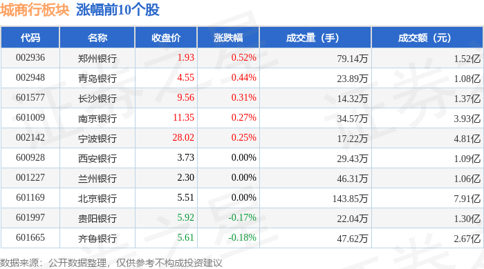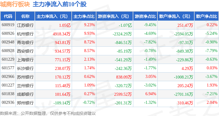 从资金流向上来看,当日城商行板块主力资金净流入9622.45万元,游资资金净流出9022.58万元,散户资金净流出599.88万元。城商行板块个股资金流向见下表:
