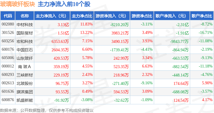 从资金流向上来看,当日玻璃玻纤板块主力资金净流入4.28亿元,游资资金净流出4886.61万元,散户资金净流出3.79亿元。玻璃玻纤板块个股资金流向见下表: