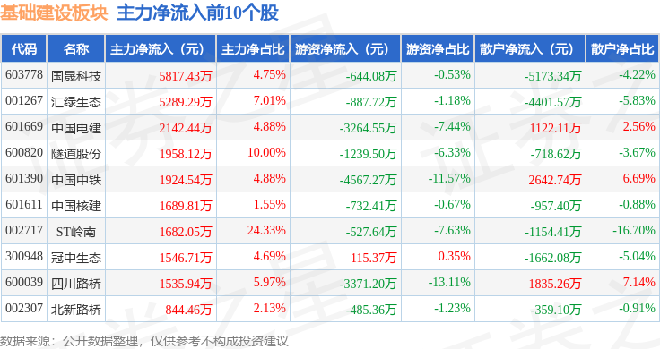 从资金流向上来看,当日基础建设板块主力资金净流出7314.41万元,游资资金净流出2.03亿元,散户资金净流入2.76亿元。基础建设板块个股资金流向见下表: