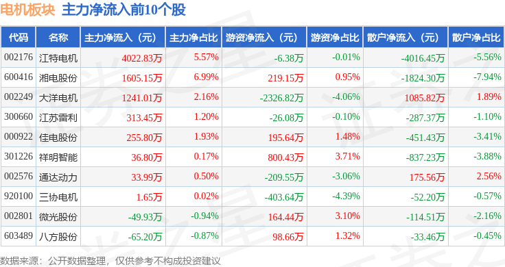 从资金流向上来看,当日电机板块主力资金净流出1.32亿元,游资资金净流出3511.69万元,散户资金净流入1.67亿元。电机板块个股资金流向见下表: