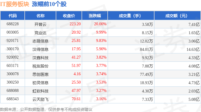 证券之星消息,12月17日IT服务板块较上一交易日上涨1.21%,开普云领涨。当日上证指数报收于3870.28,上涨1.19%。深证成指报收于13224.51,上涨2.4%。IT服务板块个股涨跌见下表: