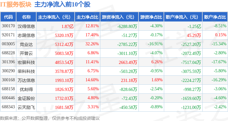 从资金流向上来看,当日IT服务板块主力资金净流出15.48亿元,游资资金净流出3.28亿元,散户资金净流入18.76亿元。IT服务板块个股资金流向见下表: