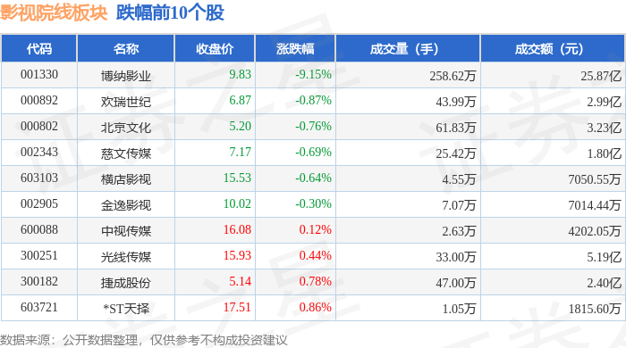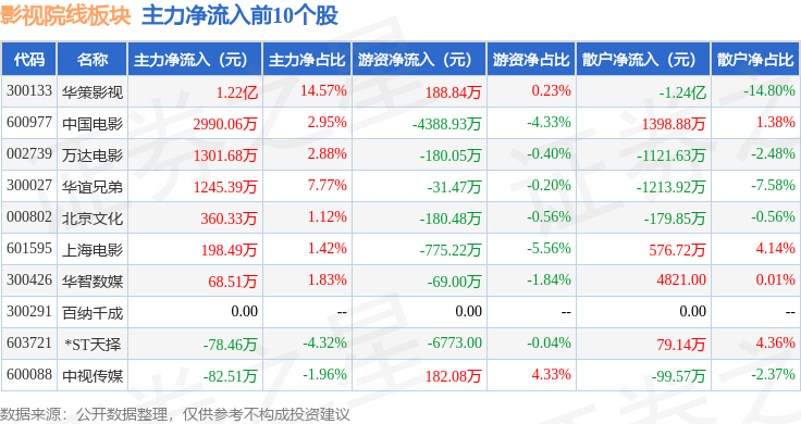 从资金流向上来看,当日影视院线板块主力资金净流出8332.49万元,游资资金净流出262.74万元,散户资金净流入8595.23万元。影视院线板块个股资金流向见下表:
